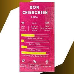 Bon Chien Chien de la Brasserie Chromatique est une bière blonde de type NEIPA à 6,7° qui joue sur la gourmandise et la fraîcheur. Sa robe trouble jaune paille laisse deviner une texture douce et onctueuse, façon "smoothie". Dès l'ouverture de la Bon Chien Chien, les houblons expressifs (Mosaic, Simcoe, Citra) libèrent des arômes de mangue mûre, d'agrumes et de zestes citronnés, pour une attaque vive mais jamais agressive. L'amertume de cette bière NEIPA reste discrète, au profit d'un bouquet fruité très juteux.