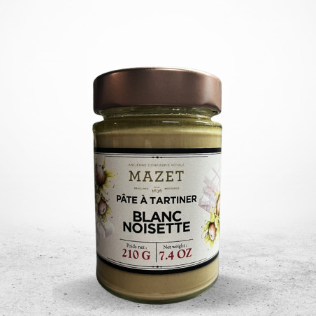 Mazet Blanc Noisette 210g : pâte à tartiner onctueuse au chocolat blanc et noisettes, texture fondante, saveur douce et intensément gourmande.