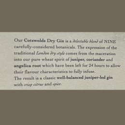 Cotswolds Dry Gin : gin anglais floral et frais, infusé aux herbes locales, notes d’agrumes et d’épices douces, finale élégante et équilibrée.