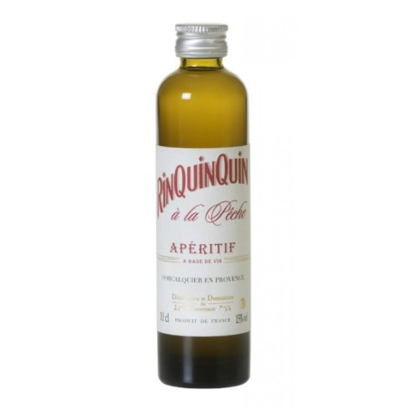 RINQUINQUIN À LA PÊCHE : Apéritif provençal élaboré selon une recette traditionnelle à base de pêches de Provence, de feuilles de pêcher, de sucre et de vin blanc, offrant une rondeur fraîche et intensément fruitée aux notes ensoleillées.