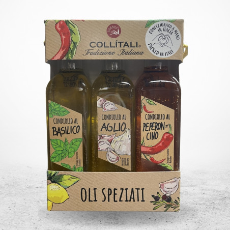 Coffret 3 huiles 3x100 ml : basilic, ail et piment, huiles parfumées aux saveurs méditerranéennes, idéales pour assaisonner pâtes, pizzas et grillades.